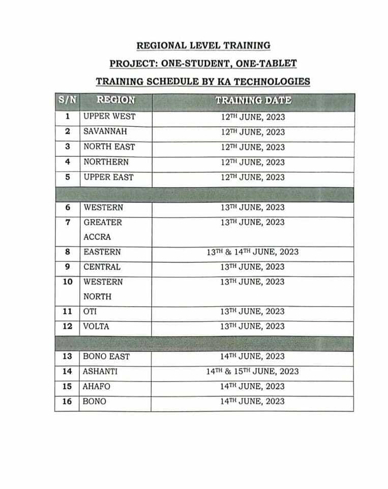 Following the announcement by the Vice President that SHS students are going to get free laptops loaded with textbooks, the Ghana Education Service (GES) has released a new One-Student-One-Table Training Timetable for the 16 regions.